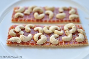 Wafle przekładamy Nutellą. Truskawki kroimy na plasterki, układamy na waflu.
